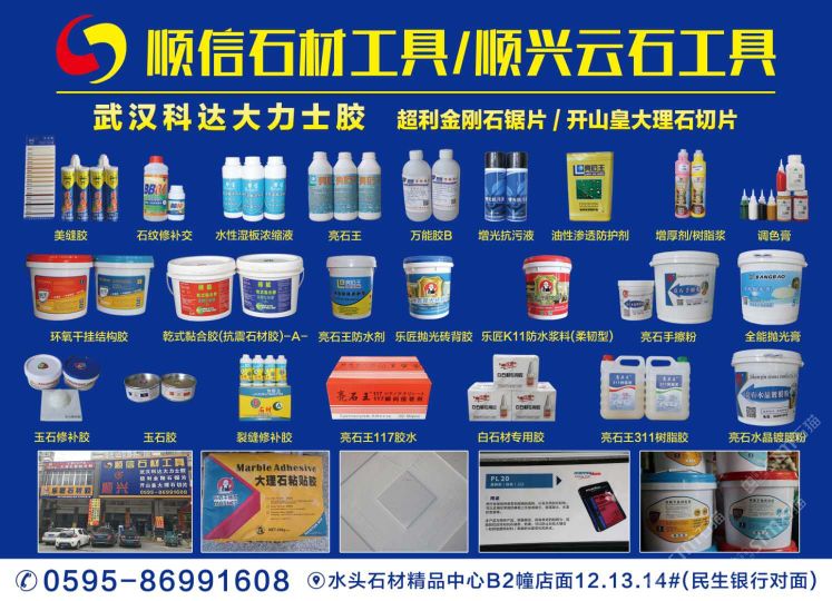 南安市順信石材工具有限公司成立于1999年,位于有“中國(guó)石材城”之稱的福建省南安市水頭鎮(zhèn)閩南建材市場(chǎng)內(nèi),分設(shè)石材工具護(hù)理部、干掛部?jī)蓚€(gè)門市部,是一家批發(fā)、零售兼營(yíng)的石材配套工具。多年來(lái),憑借產(chǎn)品的齊全、質(zhì)量的保證、信譽(yù)的可靠、服務(wù)的周到,本商行在國(guó)內(nèi)同行中已形成自己的地位和影響,并擁有龐大的客戶群體,產(chǎn)品銷至國(guó)內(nèi)各大石材生產(chǎn)基地。我們代理的品牌有:武漢科達(dá)大力士膠、環(huán)氧膠、化學(xué)錨栓、干掛膠、植筋膠等產(chǎn)品系列;亮石王防護(hù)劑、防古水、水晶膠、樹(shù)脂膠、友豐比利蠟等產(chǎn)品;粵邦消紋劑、染色劑、百亮鋼絲棉、百潔墊;旗魚(yú)、非爾、柏興、順輝、背栓螺絲;各種款式干掛件、幕墻材料輔助產(chǎn)品;磨料磨具品牌有益和、超利、順興、閩福、芒果、金山、金鋒、智輝等;進(jìn)口、國(guó)產(chǎn)防古刷、亞光磨料、大理石磨料;意大利開(kāi)山皇大理石刀具、微晶石刀具、電鍍切片、超利金鋼石切割片、軟磨片、翻新片、金鋼盤、樹(shù)脂盤;大小規(guī)格刀具、鉆頭、雕刻工具齊全;金鋼石異形輪、石材夾具、吊具、吊繩、勞保用品;電動(dòng)工具、氣動(dòng)工具、銅條、鋼條、合金工具等各種各樣產(chǎn)品齊全。