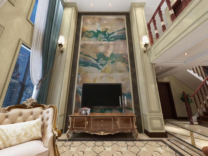 幸福家景定位于高端家裝精品石材批發(fā)商,建立了天然玉石、天然石英石、山水畫等三大板塊為主的天然石材背景墻體系!