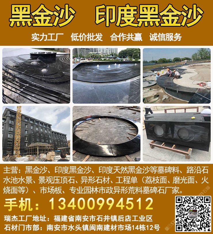 瑞杰黑金沙林總13400994512專業(yè)印度黑金沙供應(yīng)商,實力石材工廠主要加工:黑金沙、黑金砂、印度黑金沙、印度天然黑金沙、印度黑色石材、印度黑石、黑金沙石材、黑金沙花崗巖、新礦黑金砂、國產(chǎn)黑金沙、新黑金沙石材等墓碑料、路沿石、水池水景、景觀壓頂石、異形石材、工程單(荔枝面、磨光面、火燒面等)、市場板、專業(yè)園林市政異形荒料墓碑石廠家,實力工廠、低價批發(fā)、合作共贏、誠信服務(wù). 工廠地址:福建省南安市石井鎮(zhèn)后店工業(yè)區(qū),門市部:南安市水頭鎮(zhèn)閩南建材市場