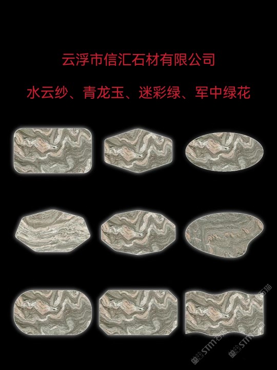 云浮市信匯石材有限公司主要經(jīng)營(yíng)土耳其云多拉灰(歐努礦、美特碼礦),奧特曼(旺程礦、捷成礦),金鑲玉、畢加索灰,主營(yíng):青龍玉、水云紗、迷彩綠!