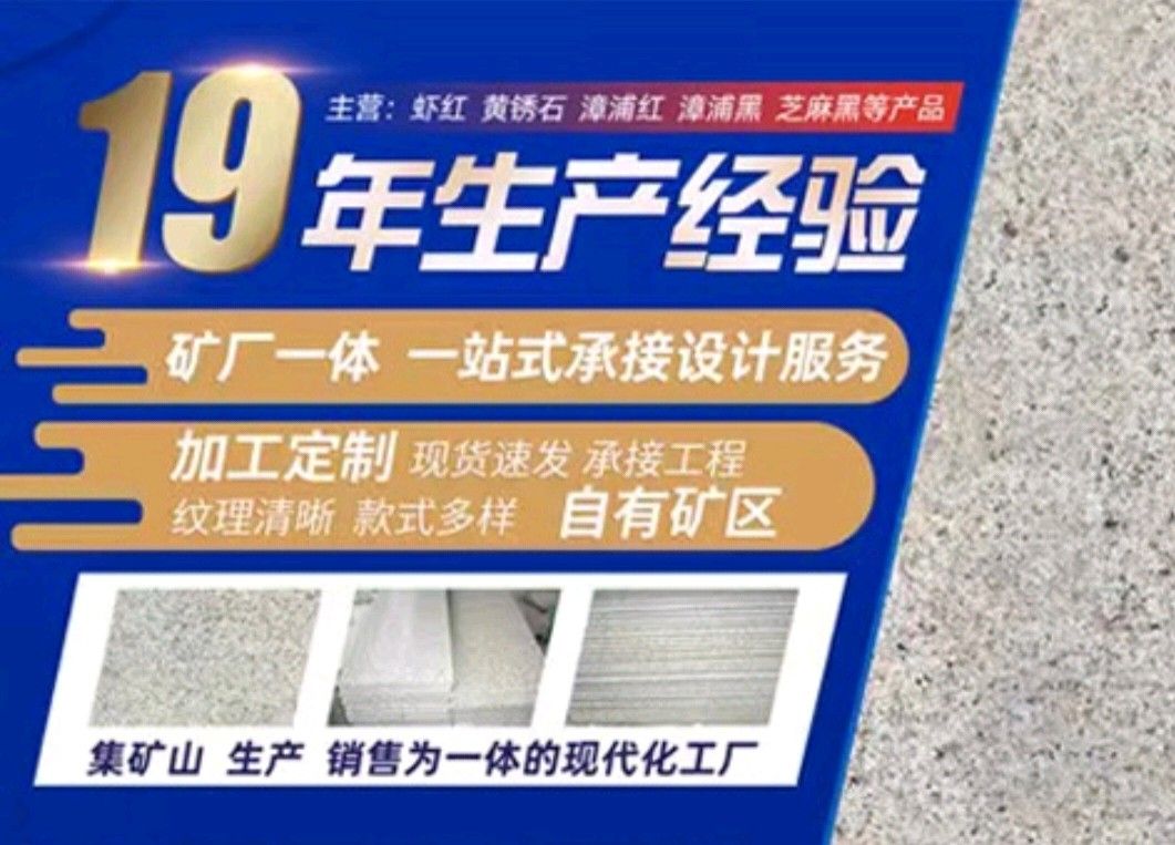 漳浦縣鴻勝石材有限公司是一家集礦山開采、自營加工生產、自主產供銷為一體的石業(yè)公司,公司擁有數(shù)家生產基地、手工加工場、大型礦山。公司創(chuàng)業(yè)歷程10年,憑著豐富的加工生產經驗、雄厚的技術力量和先進的設備,產品遠銷歐美、韓國、新加坡、臺灣等地,深受客戶的信賴與好評。 本公司產品主要有: 漳浦紅,漳浦黑,漳浦青,漳浦蝦紅,漳浦銹石,福建青,安山巖,芝麻黑,芝麻灰,沙漠棕等。