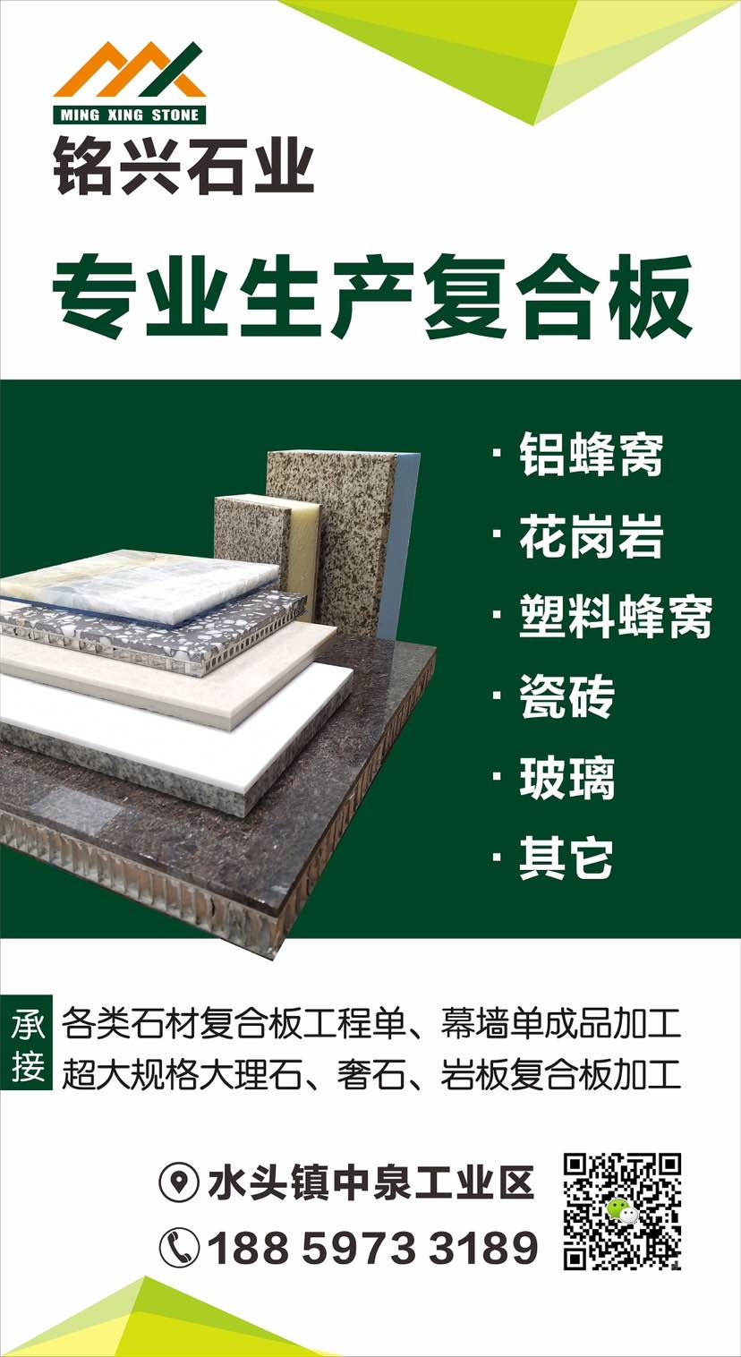 銘興石材(善德建材有限公司) 聯(lián)系人:吳先生    135****6917 查看 手機號碼:無 主營范圍: 薄板復(fù)合板加工、大理石加工、花崗巖加工、石材輔料及特殊工藝、大板批發(fā)、 企業(yè)地址:福建泉州水頭鎮(zhèn)中泉工業(yè)區(qū)