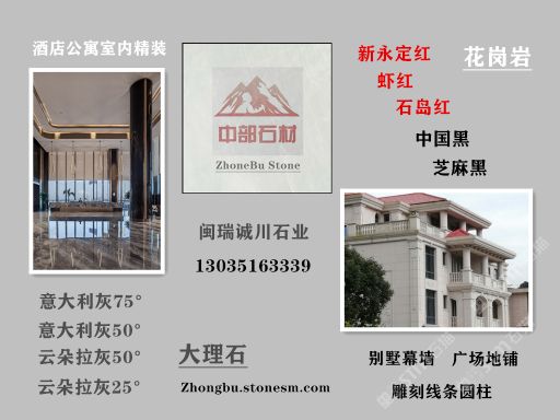 湖北閩瑞誠川石業(yè)有限公司 聯(lián)系人:陳小川    187****5623 查看 187****5623 查看 主營范圍: 花崗巖加工、異型加工、石材工程資質(zhì)企業(yè)、荒料|花崗巖加工|大理石加工|礦山|異型加工|石材外貿(mào)、大理石加工、 企業(yè)地址:福建南安海西石材城3D-3