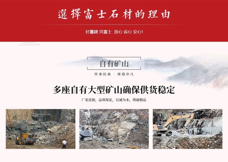 發(fā)布信息: 富士石材位于世界石雕之都——福建惠安,于1996年成立,主營墓碑生產(chǎn)、墓碑研發(fā)設(shè)計、公墓運營&殯儀館運營、公墓陵園景觀、規(guī)劃設(shè)計等一條龍殯葬服務(wù)。公司自成立以來不斷引進當今世界先進的生產(chǎn)設(shè)備及加工工藝,用專業(yè)的設(shè)備造優(yōu)秀的產(chǎn)品。公司擁有一大批經(jīng)驗豐富的技術(shù)型管理人才,以嚴謹?shù)墓芾硖峁└咝У姆?wù),并配以先進的電腦設(shè)計及現(xiàn)代化企業(yè)管理模式,秉承 “以客戶為中心、以質(zhì)量為根本,以市場為導向、以人文為基礎(chǔ)”的經(jīng)營理念,經(jīng)過將近三十年的發(fā)展,逐步發(fā)展成為一家集墓碑加工生產(chǎn)、研發(fā)設(shè)計、陵園規(guī)劃設(shè)計、公墓運營&殯儀館運營為一體的公司。