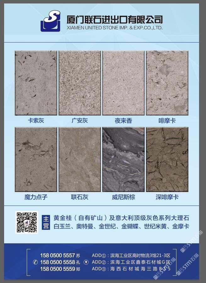 廈門聯(lián)石進(jìn)出口有限公司 聯(lián)系人:鄭俊彬    158****5559 查看 手機(jī)號(hào)碼:無(wú) 主營(yíng)范圍: 礦山、荒料、大板批發(fā)、石材外貿(mào)、 企業(yè)地址:福建泉州水頭鎮(zhèn)濱海工業(yè)區(qū)高時(shí)3館8倉(cāng)3區(qū)