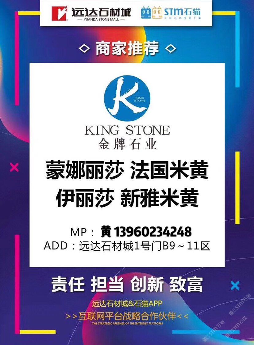 遠(yuǎn)達(dá)·金牌石業(yè) 聯(lián)系人:黃志金    139****4248 查看 139****4248 查看 主營(yíng)范圍: 大板批發(fā)、荒料、石材外貿(mào)、 企業(yè)地址:福建泉州福建省南安市遠(yuǎn)達(dá)石材城B9