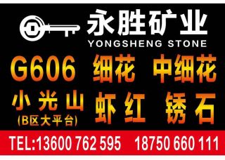 永勝礦業(yè)主營(yíng)產(chǎn)品:象牙白(光面),象牙白1,G606,黃銹石,霞紅,G606(副礦),G606(礱石),G606(正礦),蝦紅1,銹石2,銹石(荔枝面),黃銹石(荔枝面),銹石,蝦紅,蝦紅G681,蝦紅荔枝面,G681,G681蝦紅(光面)企業(yè)地址:福建泉州南安市聯(lián)合二路匯創(chuàng)物流園